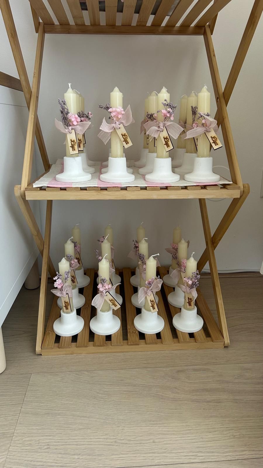 Kandelaar met kaars en naam label, lint in gewenste kleur